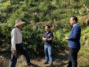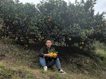毛壮壮与脐橙种植大户交谈(左)并帮其推销脐橙(右)